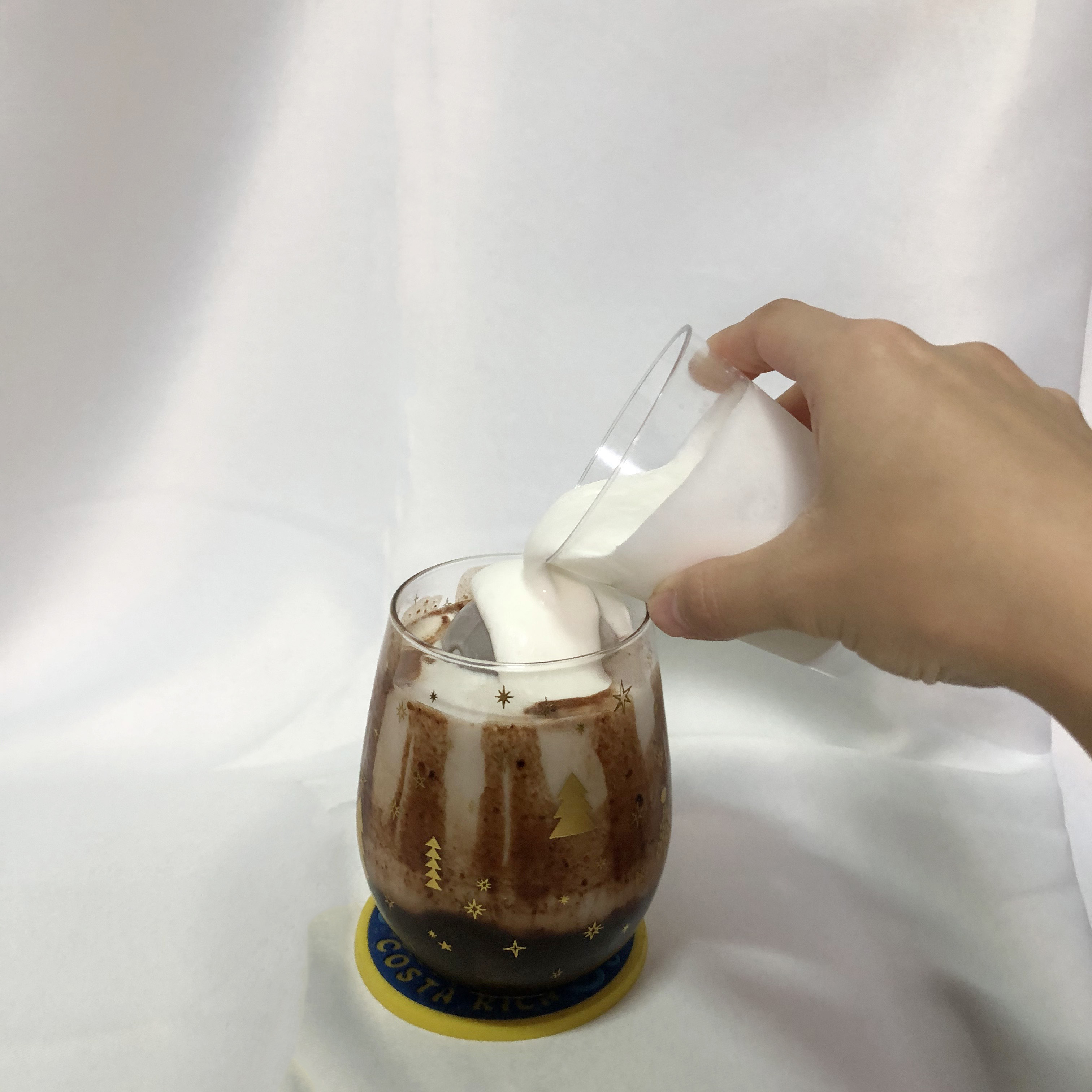얼음을 넣고 우유를 부어줍니다. 초코 소스가 우유보다 무거워서 어차피 초코소스가 가라앉기 때문에 우유는 막 부어주셔도 상관 없어요!