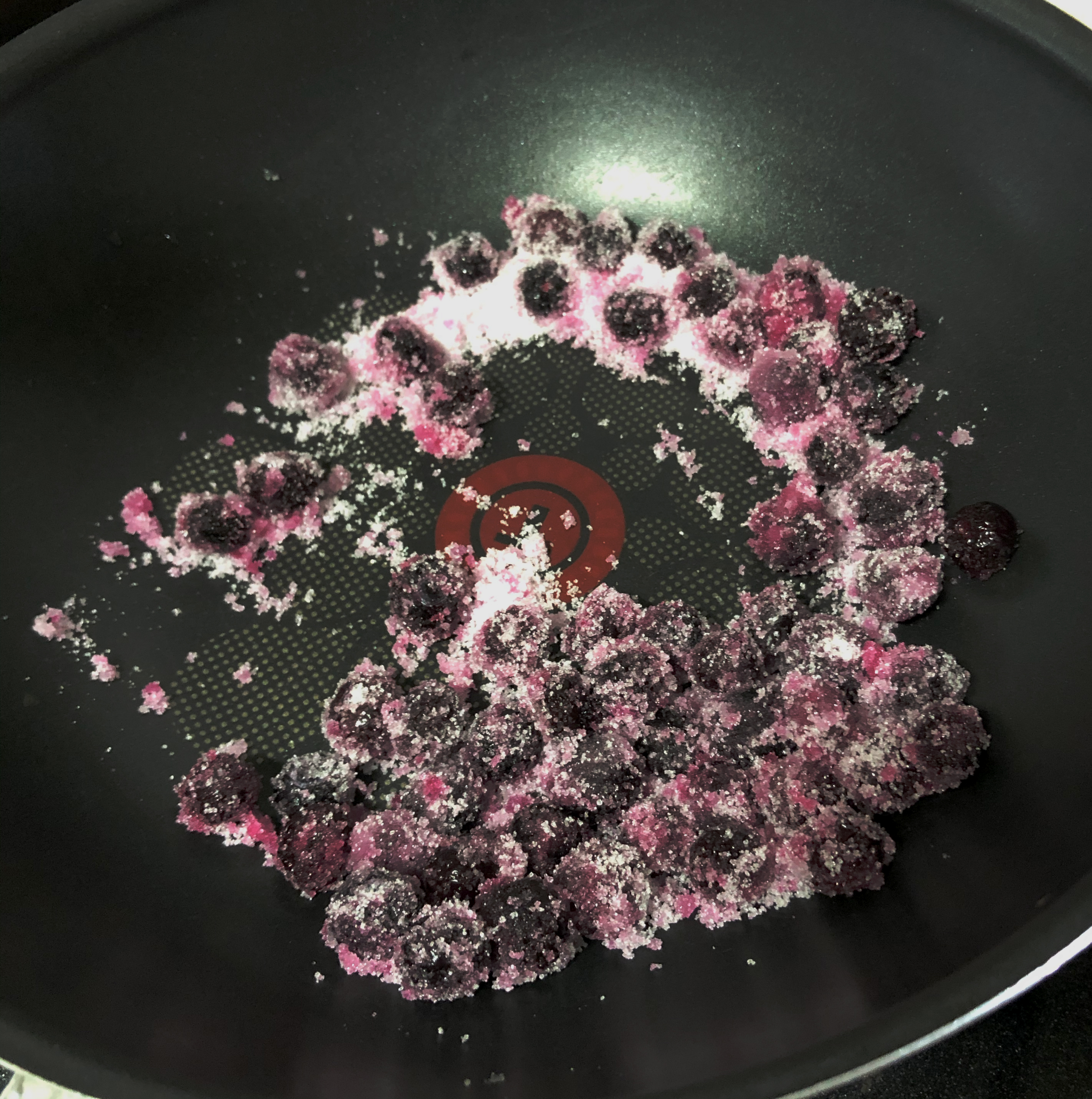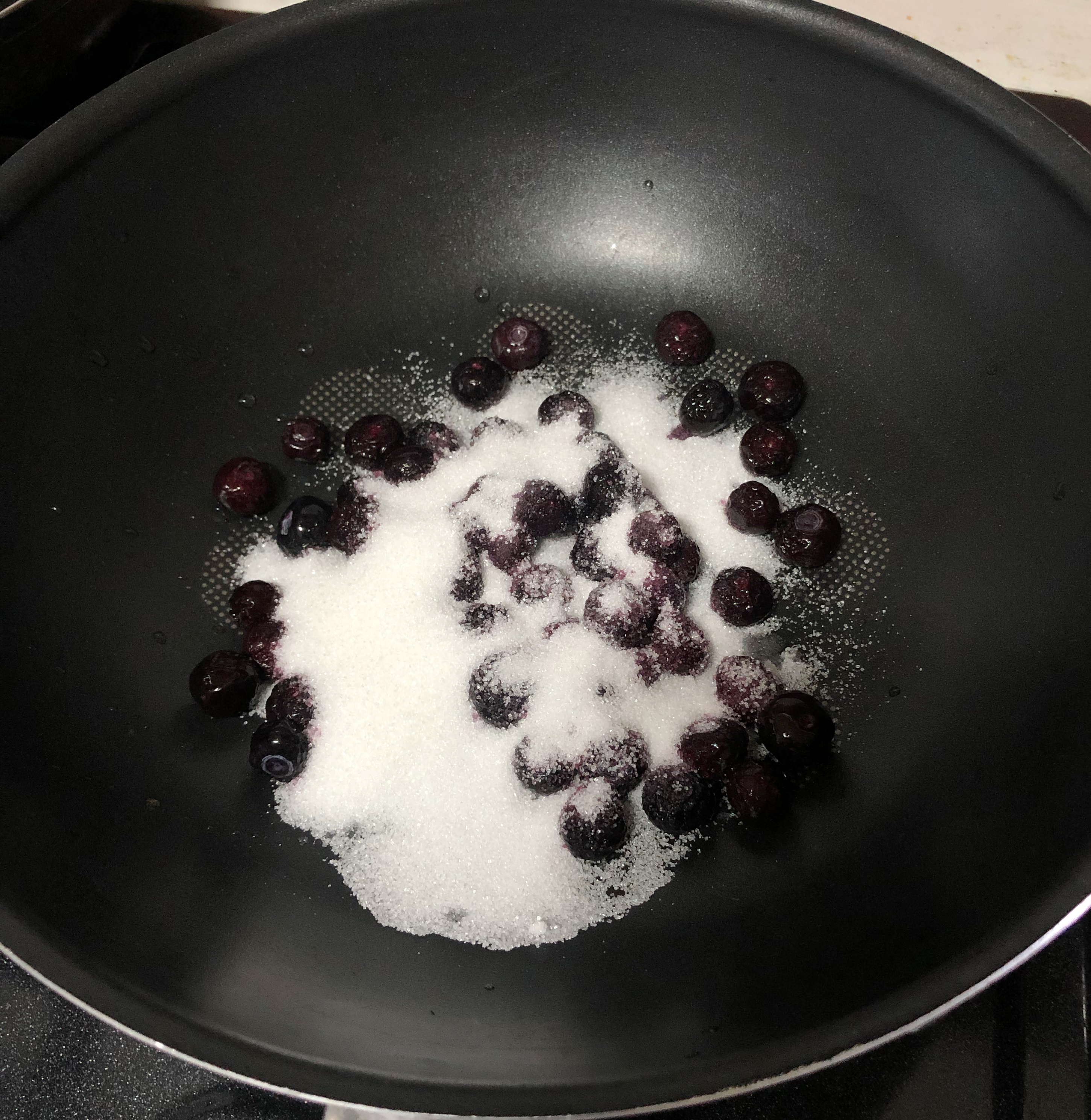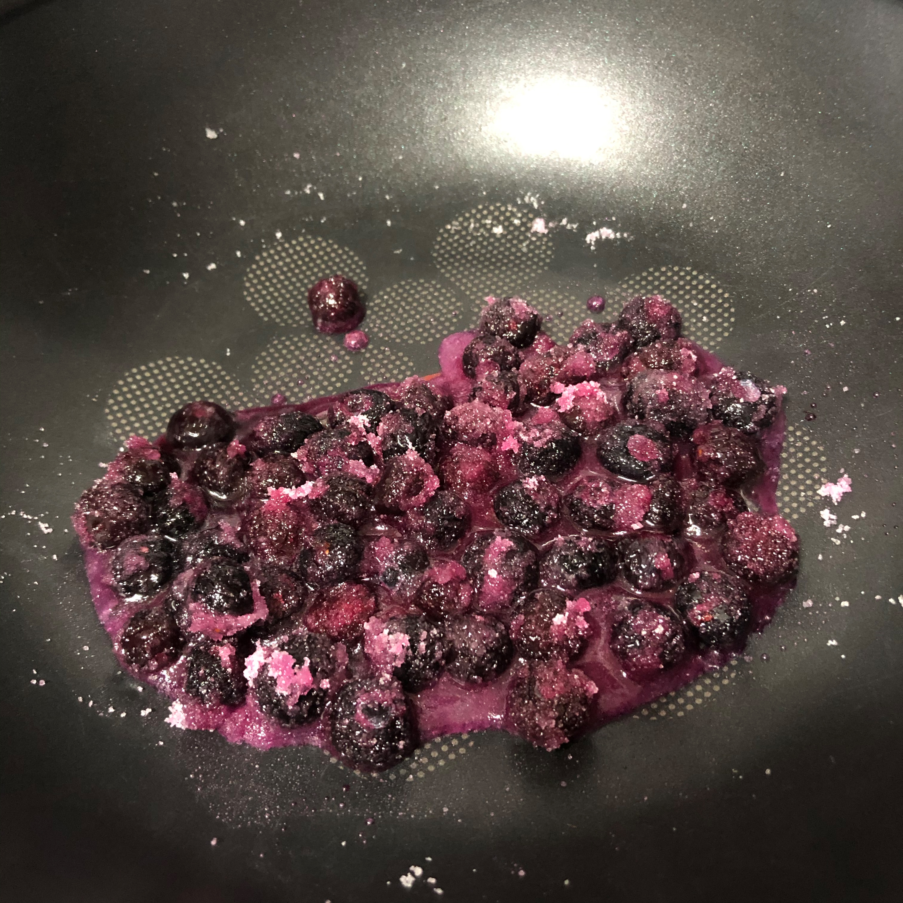 그 다음엔 코팅된 팬에 블루베리와 설탕을 넣어주세요.